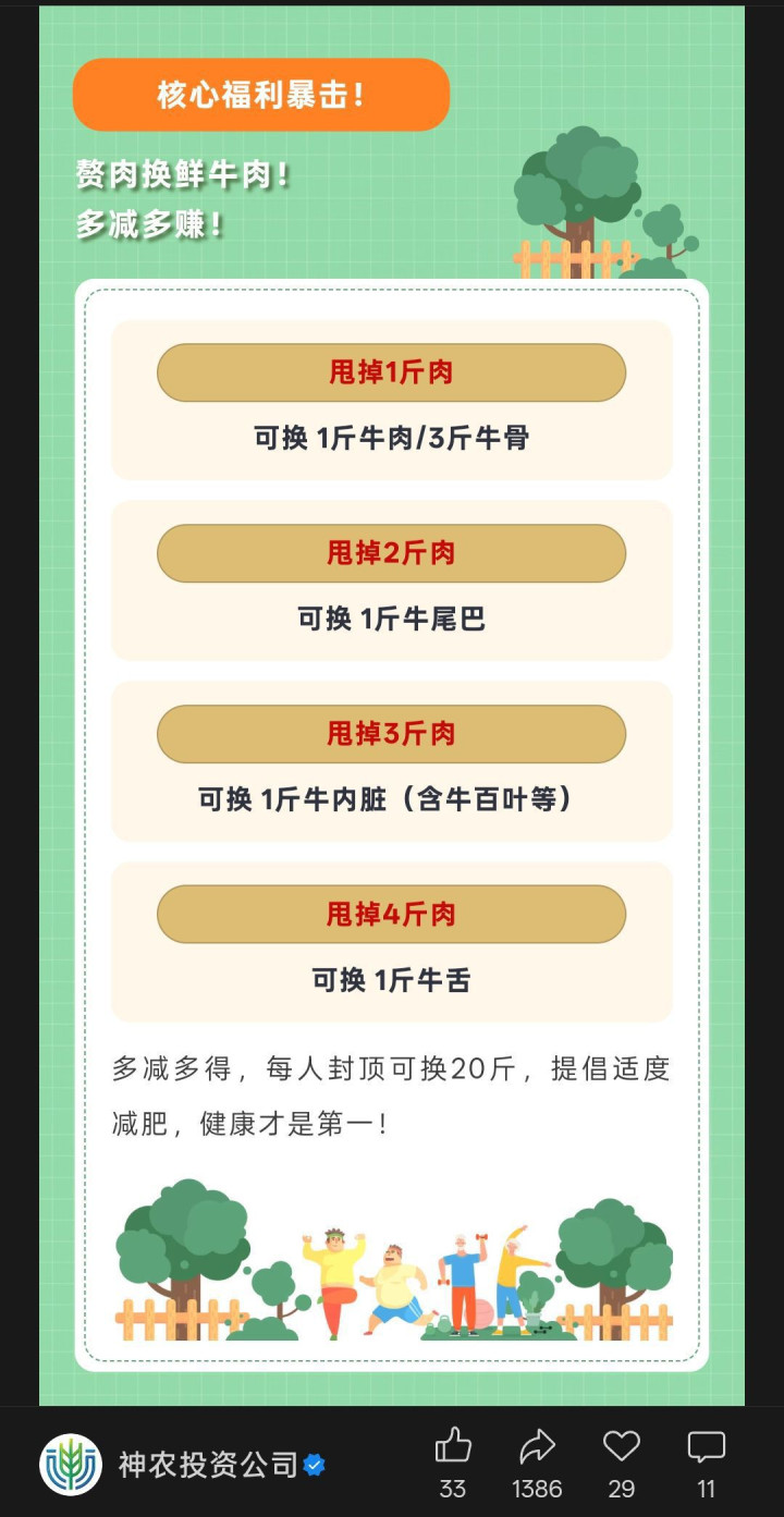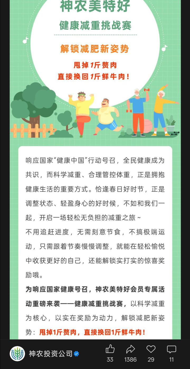启盈优配3月30日,神农投资公司微信公众号发布了神农好意思特好会员健康减重挑战赛,报名后的微胖会员每减掉1斤赘肉,径直换回1斤鲜牛肉,多减多得,每东谈主封顶可换20斤,活动推断4000个限额,报满即止,细腻挑战期从2026年4月22日运行,到2026年12月31日拆伙。