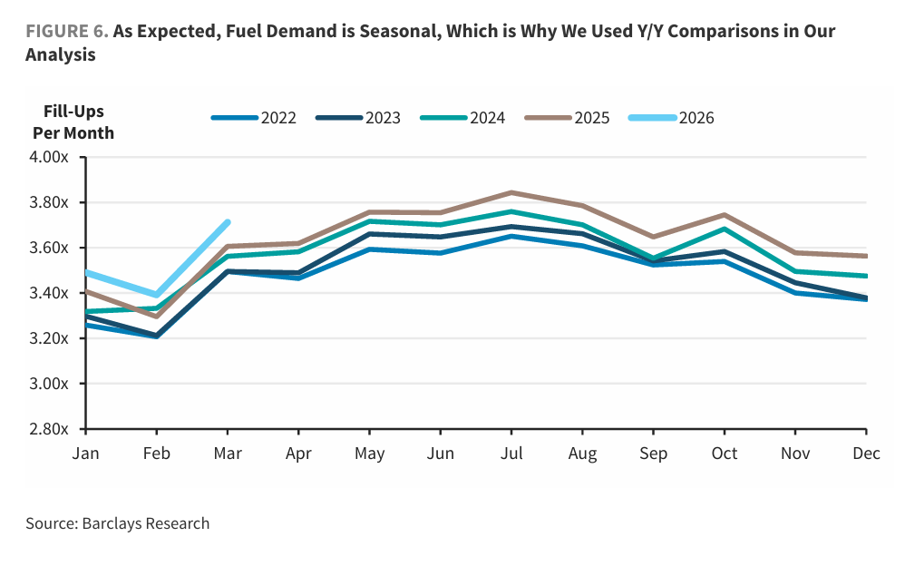接触初期曾霎时出现加油频次上升的反常征象。分析师觉得,这可动力于部分消费者预期油价将持续高涨、取舍提前"加满"以遮盖本钱上升。但跟着接触执续,这一效应迟缓消退,加油频次随之稳步下滑并转为同比负增长。两项目的吞并来看,巴克莱觉得足以组成好意思国消费者正在削减燃油消费的早期字据。