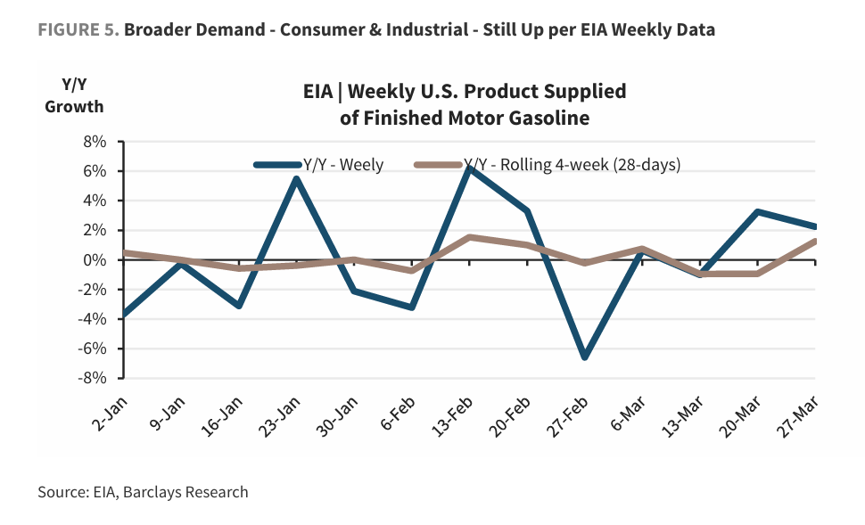 据此推算,自伊朗接触爆发以来油价累计高涨约40%,表面上对应消费者与工业端汽油需求系数下落约3%。关系词,EIA扬弃3月27日的数据娇傲,四周升沉口径需求仍同比增长1%,尚未印证上述下行展望。