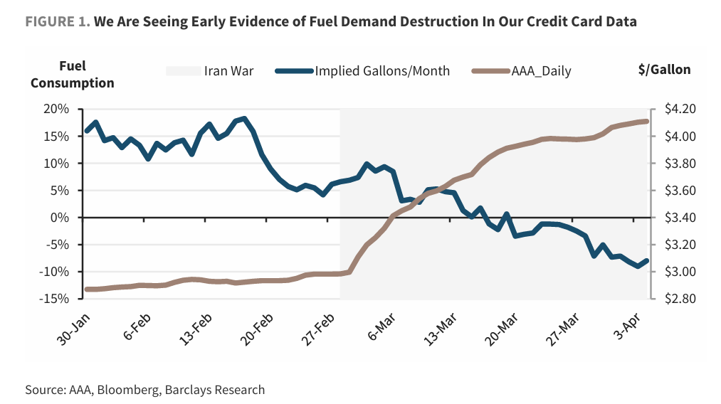 巴克莱分析师指出,上述趋势险些在伊朗接触爆发、油价开动飙升的第一周就已露条理,至接触第四周时,燃油消费总量已负责转为同比负增长。这一高频信用卡数据所揭示的需求萎缩信号,对研判巨额商品走势及消费端韧性具有遑急参考价值。