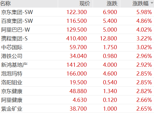 港股高开,抑遏发稿,恒生指数涨1.14%,恒生科技指数涨2.26%。科网股全线走强,京东集团涨近6%,阿里巴巴、百度集团涨超4%,哔哩哔哩、中芯海外涨超3%。
