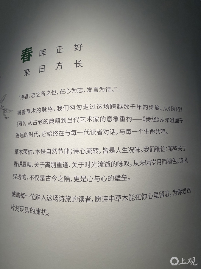 从“逃之夭夭”的幸福,到“蒹葭苍苍”的痛惜,再到“黍稷重穋,禾麻菽麦”的将强,草木早已成为中国情面感的密码。3月28日,“文籍有深嗜”系列展第二辑“让诗风穿透一切——《诗经》草木预见主题展”在上海藏书楼东馆一号展厅与读者碰面。
