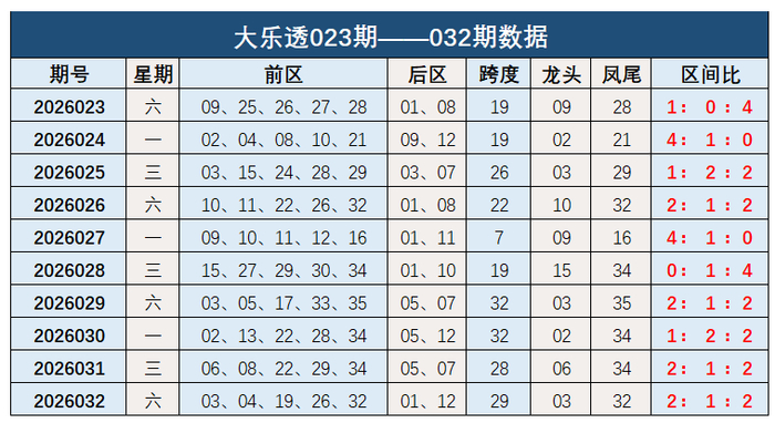 大乐透第2026032期出奖号统计:前区03、04、19、26、32,后区01、12。前区跨度29,龙头03,凤尾32,区间比比2:1:2。