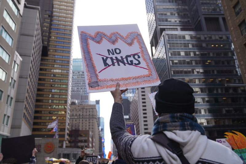 在好意思国纽约,抗议者手举“不要国王”标语牌。新华社记者 张凤国 摄
