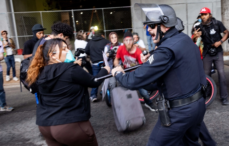 在好意思国加利福尼亚州洛杉矶,又名抗议者与功令东说念主员宝石。新华社/法新