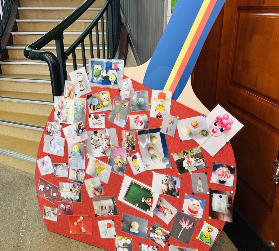 浩瀚的乒乓板被像片贴满,像片中是孩子们用乒乓球制作的各式创意艺术品