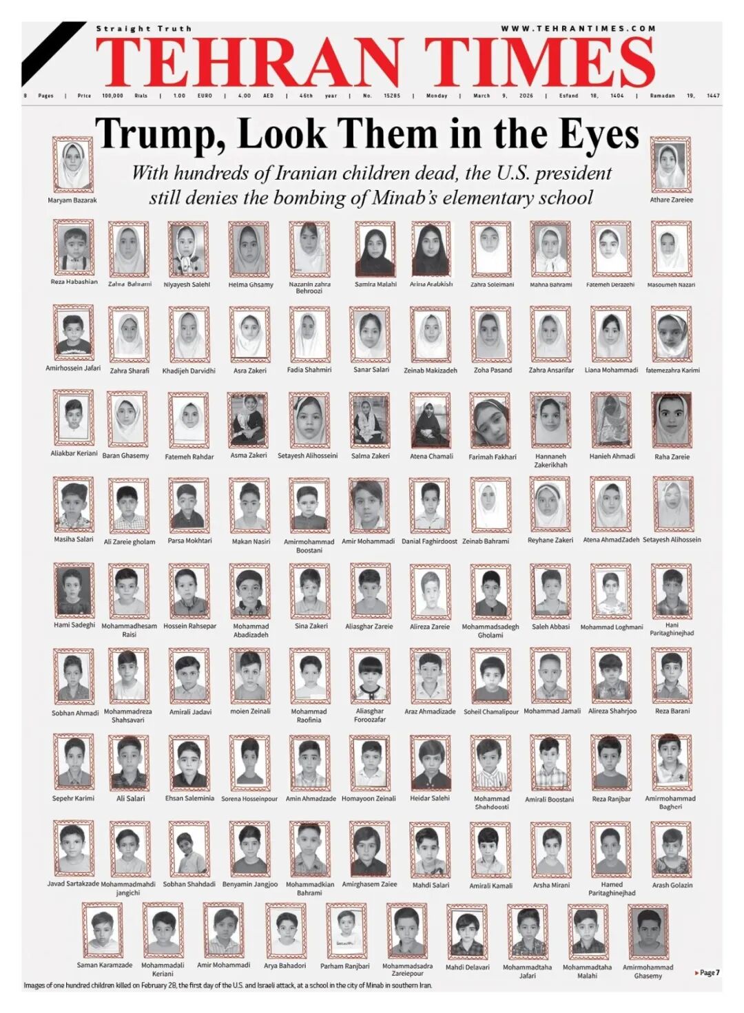 3月9日伊朗《德黑兰时报》头版,刊发了伊朗南部米纳卜市一所小学受害儿童的遗照。