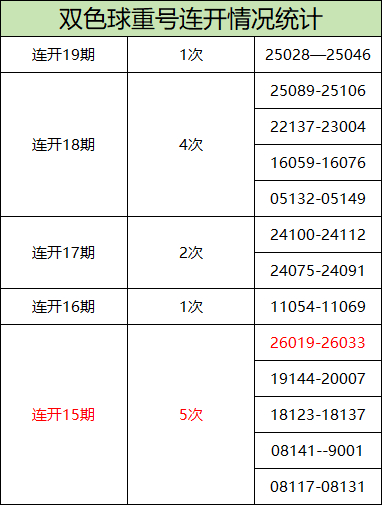 在双色球开奖历史上,重号连开15期的情况共出现过5次,上一次开出这一方式的还要追溯到2019年。不外,这并不是重号连开的极限,在昔时,重号还曾连开16期、17期、18期甚而19期。