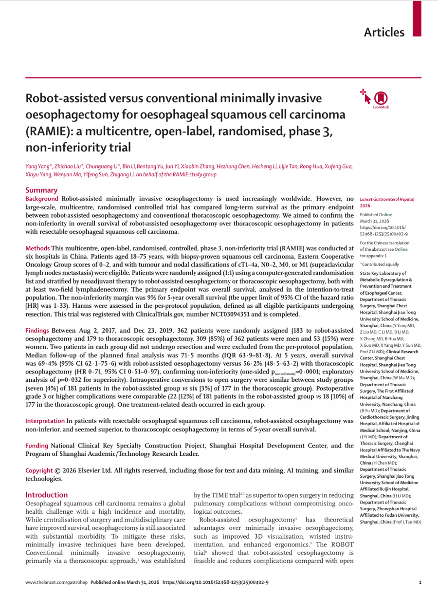 4月1日,由上海市胸科病院胸外科主任李志刚教师团队牵头开展的宇宙多中心临床究诘RAMIE赢得最新阐述,联系后果发表于国外顶级消化病学期刊《柳叶刀-胃肠病学和肝脏病学》(Lancet Gastroenterology & Hepatology)。RAMIE究诘是寰球首项比较机器东说念主接济和传统胸腔镜接济食管癌根治术的前瞻性、多中心、立地对照测验,它阐发了机器东说念主接济微创外科诊疗在食管癌中能赢得长久糊口获益,为诸多食管癌患者燃烧了生命的新但愿。李志刚主任是论文的通信作家,胸外科杨洋、刘智超医师是论文的共同第一作家。
