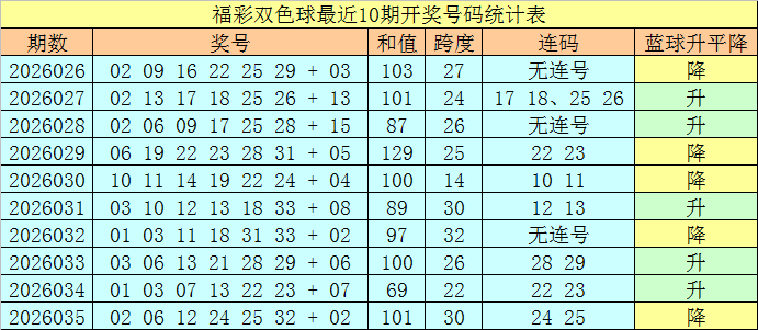 上期开奖:福彩双色球第2026035奖号开出:02 06 12 24 25 32 + 02,红球号码和值为101,首尾间距为30,包含连号:24 25。