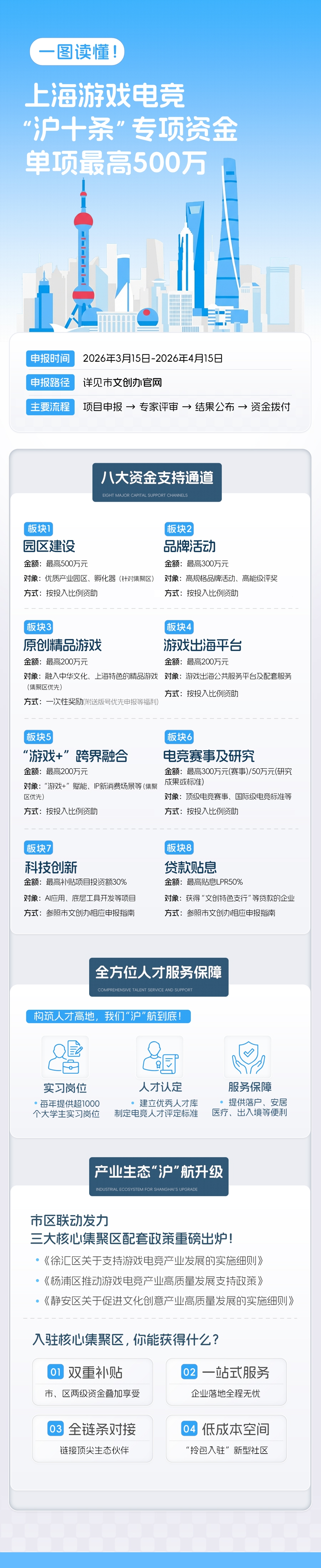 为推动上海游戏电竞产业高质料发展,构建具有全球影响力的产业生态体系,《上海市对于支执游戏电竞产业发展的些许举措》(简称“游戏沪十条”)已于近日印发,围绕环节边界,建议系统性支执政策。4月7日,市文创办将发布2026年度上海市文化创意产业发展专项资金讲述指南,其中包含“游戏沪十条”支执神气讲述形貌。