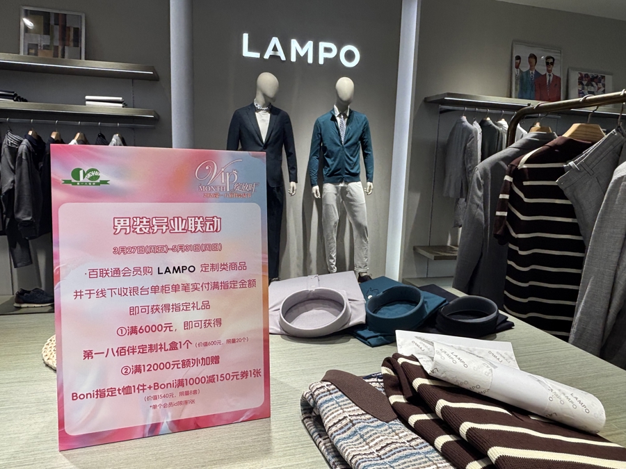 再上五楼,这里汇聚了VSKONE(威斯康尼)、LAMPO(蓝豹)、SATCHI(沙驰)、Callisto(卡利斯特)等多家中高端男装品牌。这里虽不如女装区东说念主头攒动,但客单价却不低。记者了解到,这些品牌均提供一双一量体、面料甄选、细节修改等全历程奇迹,还可在衣物上刺绣姓名、系念日、星座等专属钤记。这些细节让顾主感受到,买到的不仅仅一套衣服,更是一张别东说念主无法复制的 “第二张柬帖”。