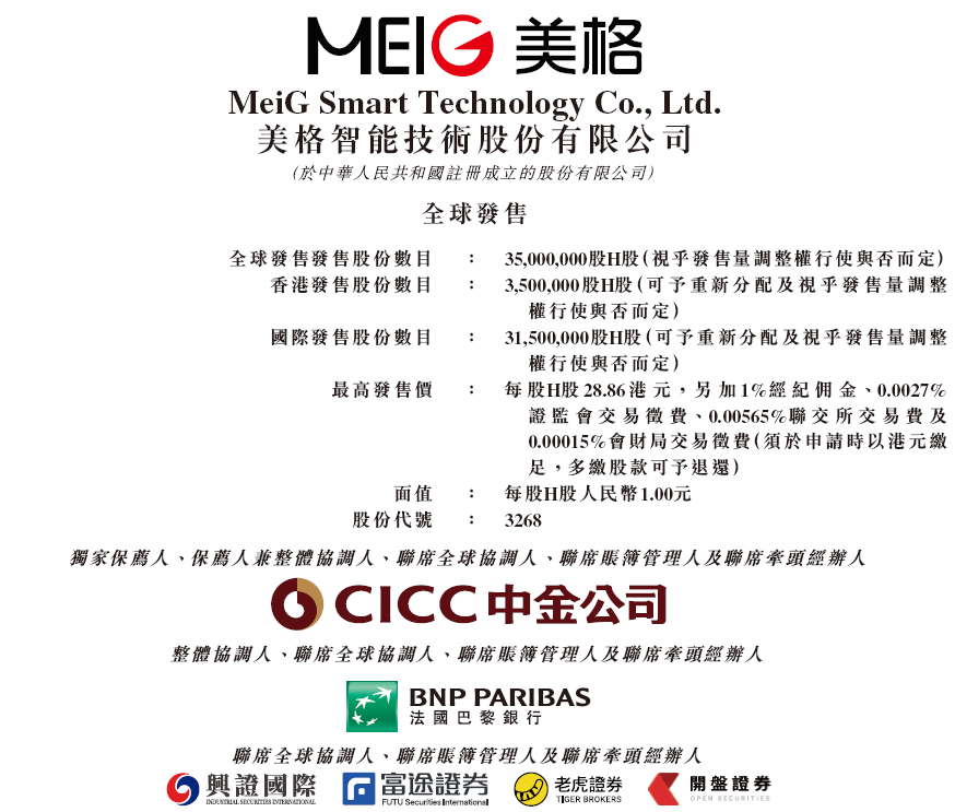 好意思格智能,蓄意大师发售3500万股H股(占刊行完成后总股份的11.79%,另有15%发售量改变权),其中90%为国际发售、10%为公设备售。每股发售价不高于28.86港元,每手100股,入场费2,915.10港元,最多募资约10.10亿港元。