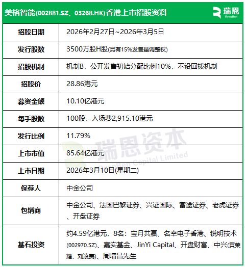 来自广东深圳宝安区的A股公司好意思格智能(002881.SZ)(03268.HK),至本日起至下周四(3月5日)招股,预测2026年3月10日在港交所挂牌上市,中金公司独家保荐。